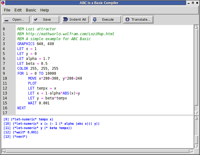 ABC is an interpreter for the BASIC language written in Scheme that I developed during my third year at the university. It provides many features, including an Integrated Development Environment (IDE) and a small graphics API.