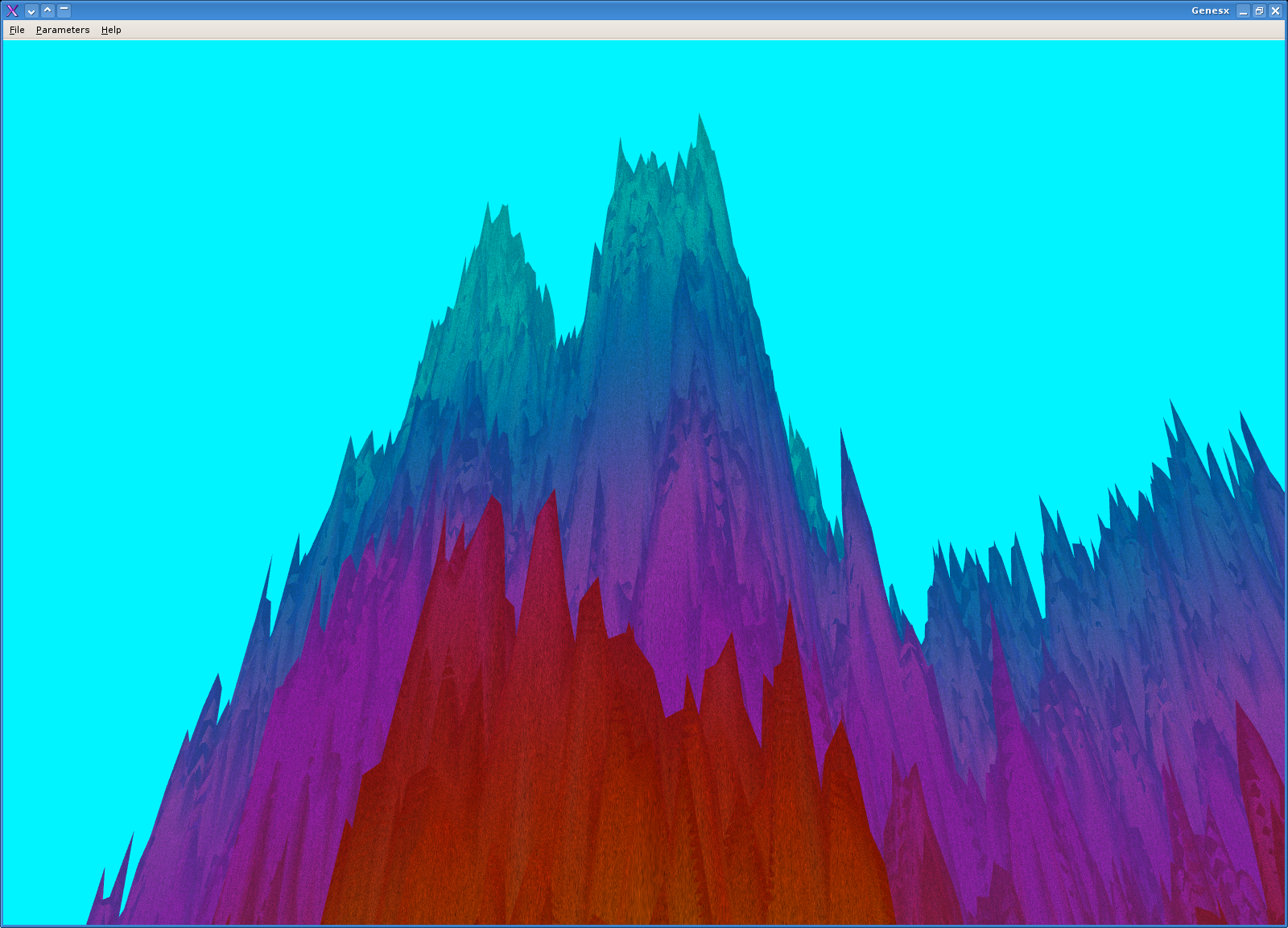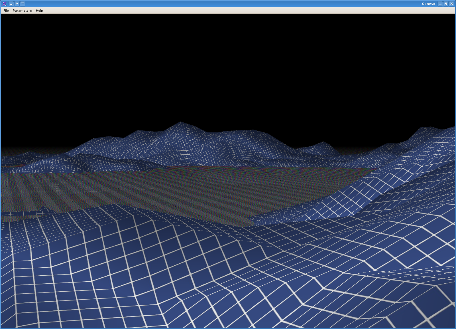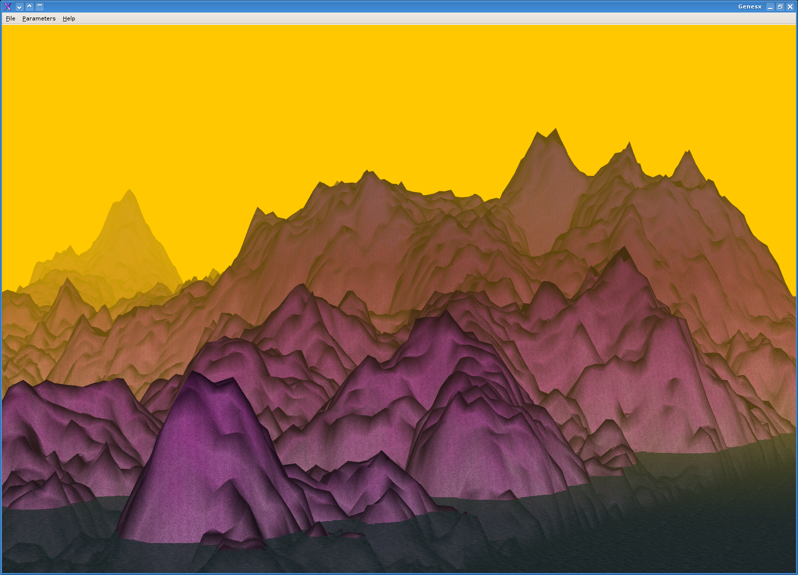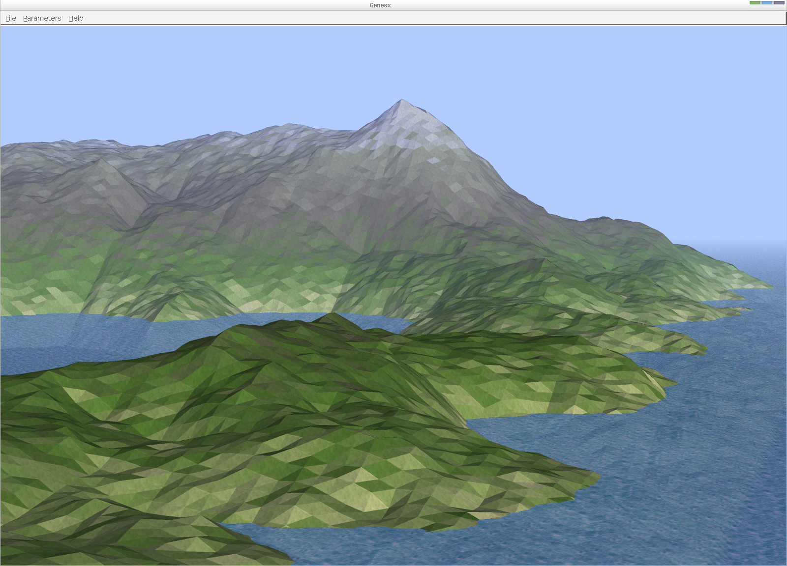 Genesx is a 3D landscape generator written in C with Gtk and OpenGL that I developed during my fourth year at the university. It uses a fractal algorithm to generate random landscapes based on many parameters specified by the user.