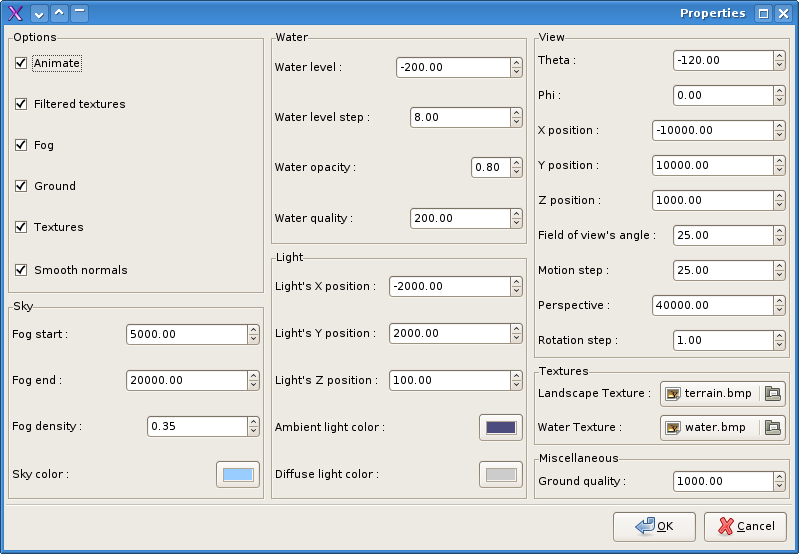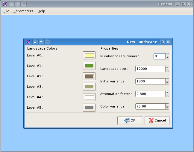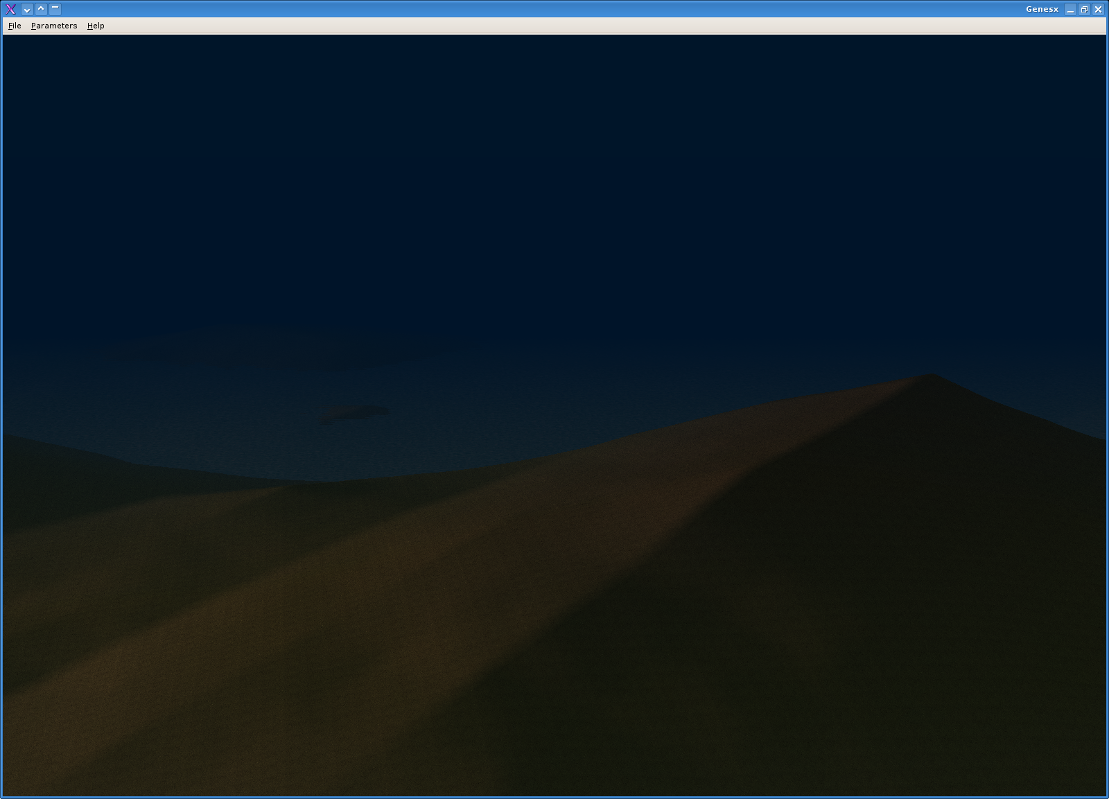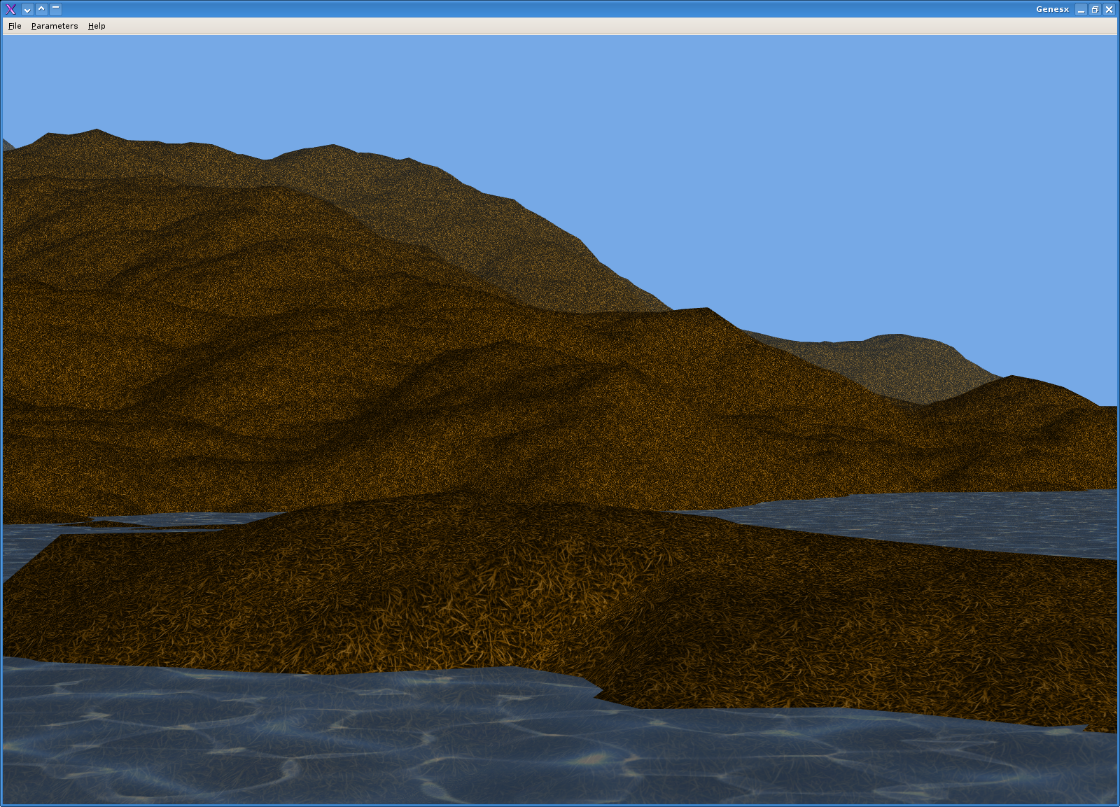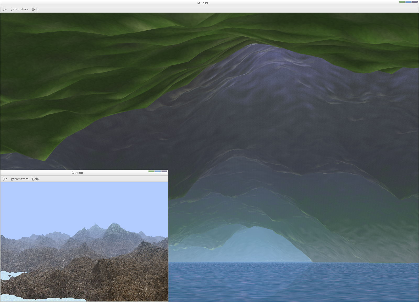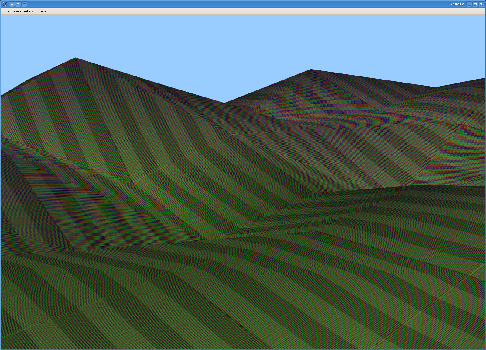 Genesx is a 3D landscape generator written in C with Gtk and OpenGL that I developed during my fourth year at the university. It uses a fractal algorithm to generate random landscapes based on many parameters specified by the user.