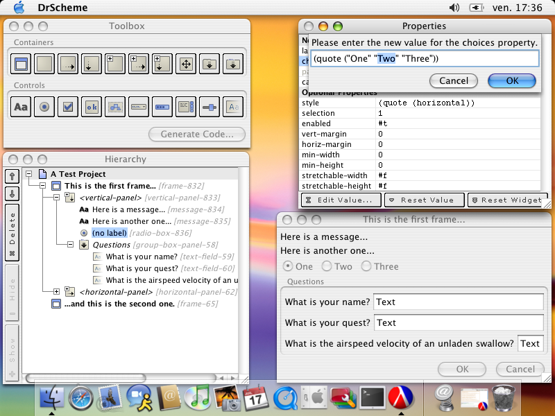 MrEd Designer is a GUI designer I developed during my second year at the university. The idea was to develop a tool similar to (albeit not so feature-rich as) the Qt Designer for the MrEd graphical environment.