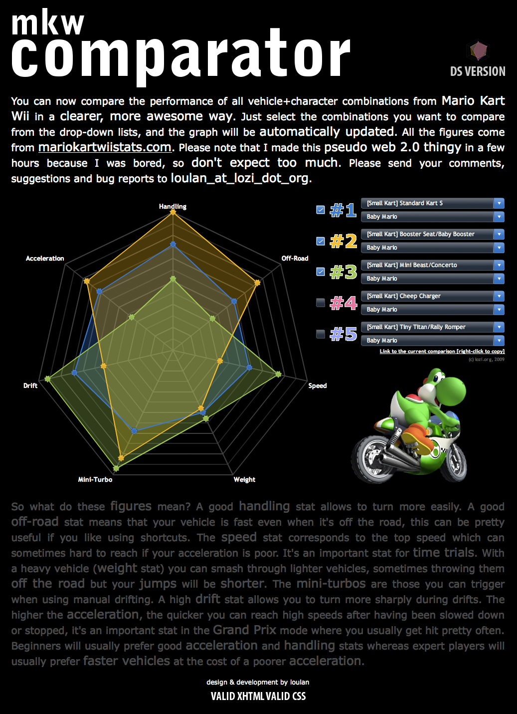 This web application offers the possibility to compare the performance of all vehicle+character pairs in Mario Kart Wii via a radar graph. A Mario Kart DS version is also available.